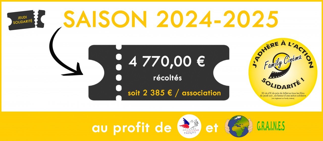 Tous les jeudis soirs, le FAMILY CINÉMA reverse 0,50 € par places vendues à deux associations sensibilisant au respect de l'environnement et/ou au handicap sur le territoire.